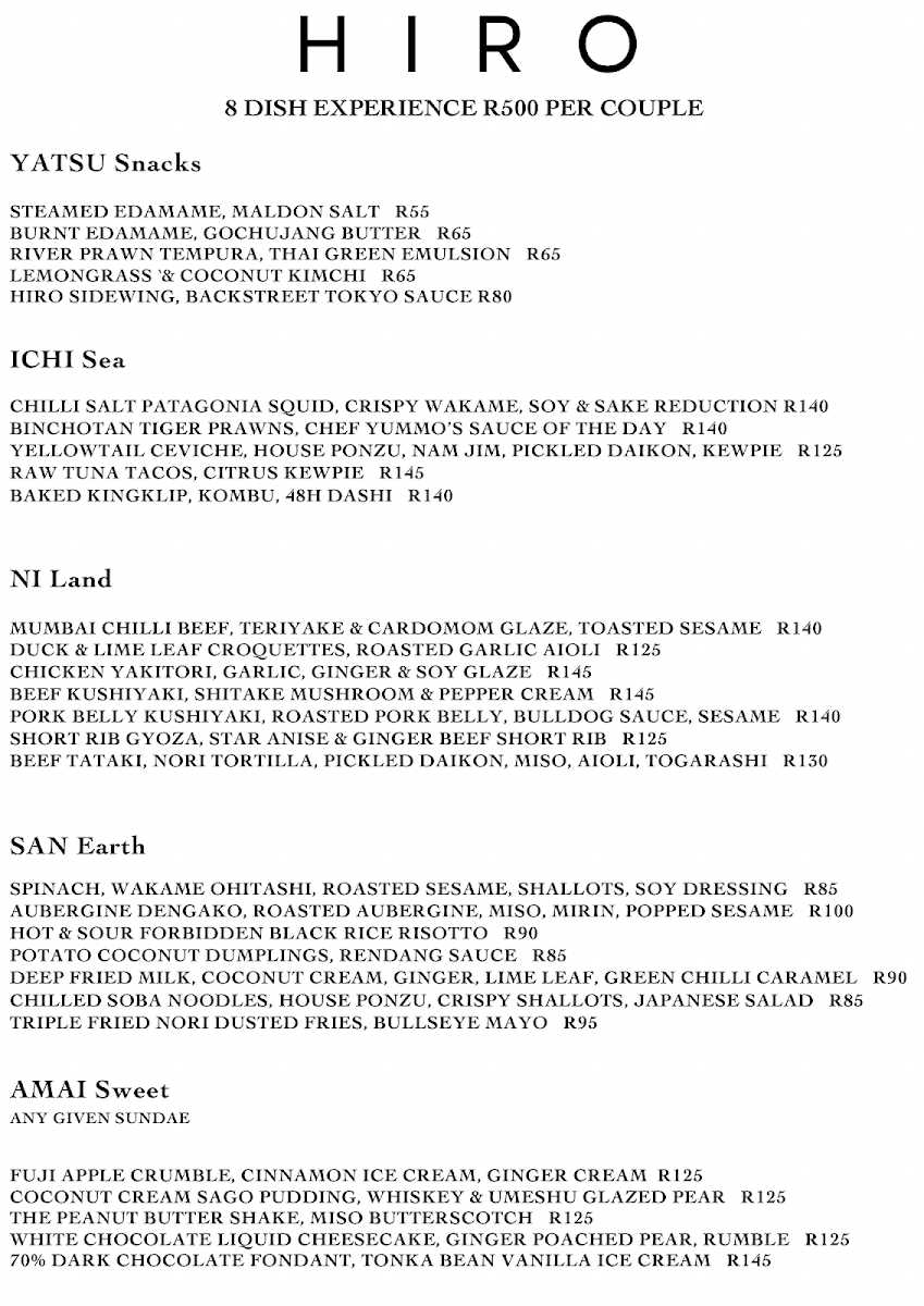 Welcome to Hiro Izakaya, an enchanting culinary gem nestled in the beautiful Constantia Uitsig wine farm, Cape Town. This charming venue promises an unforgettable experience through its thoughtfully curated menu divided into four delightful categories: Sea, Land, Earth, and Sweet.